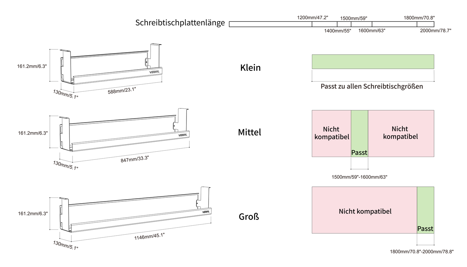 - Mittel (847 × 130 × 161,2 mm, 2,6 kg)